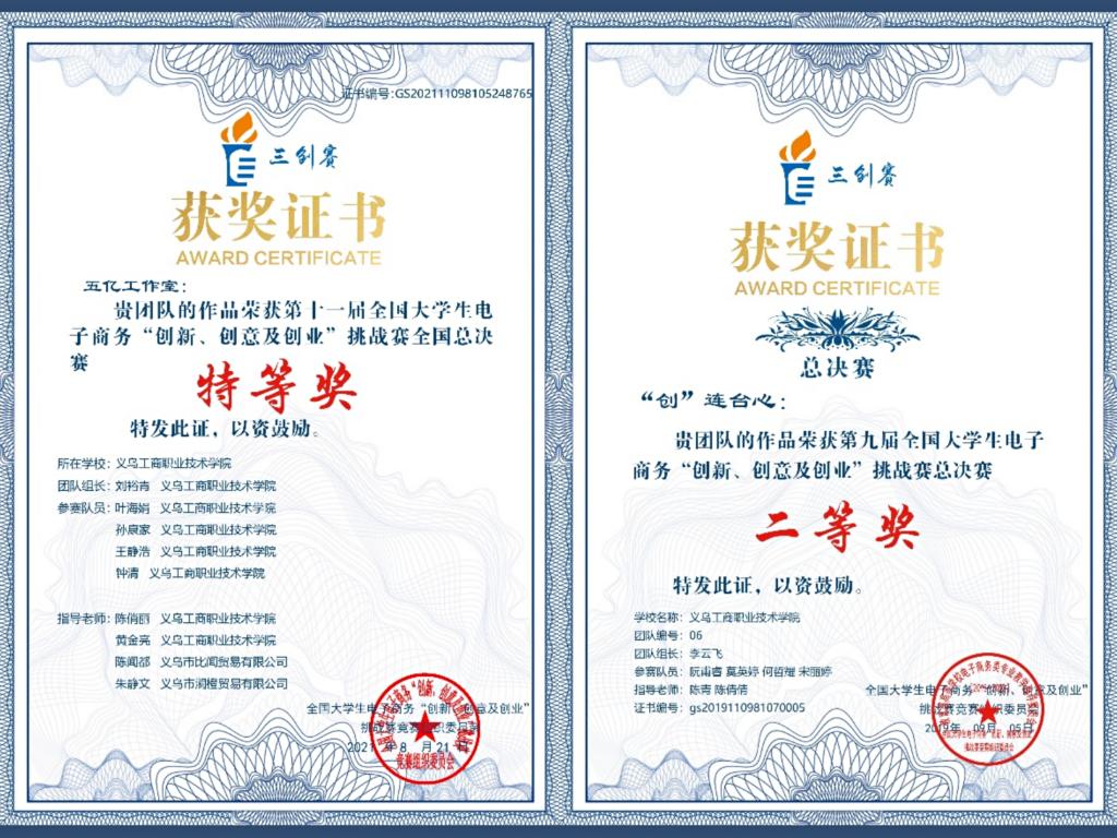 专业教师指导学生参加省级或行业跨境电商技能大赛,以及创新创业类相关比赛,取得了丰富的成果,在2021年第十一届全国大学生电子商务“创新、创意及创业”挑战赛总决赛荣获特等奖。