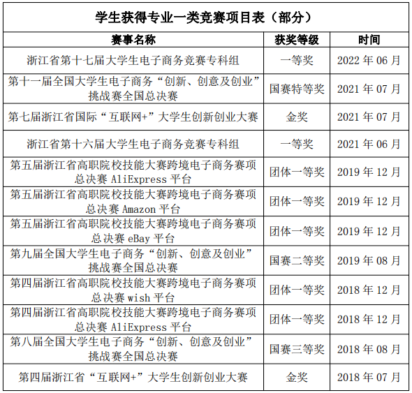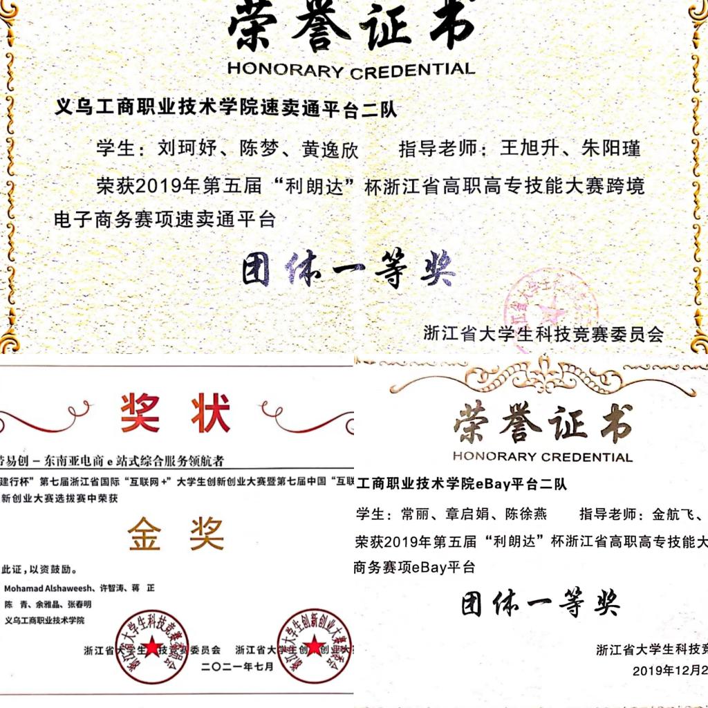 专业教师建设课程《跨境电子商务实务》,于2019年获评浙江省高校教育信息化优秀案例,2020年获评浙江省高职院校“互联网+教学”优秀案例一等奖,2021年入选第一批省级课程思政示范课程拟立项名单(高职),其相应的在线课程《跨境电商创业》是国家级职业教育创新创业教育教学资源库主干课程;